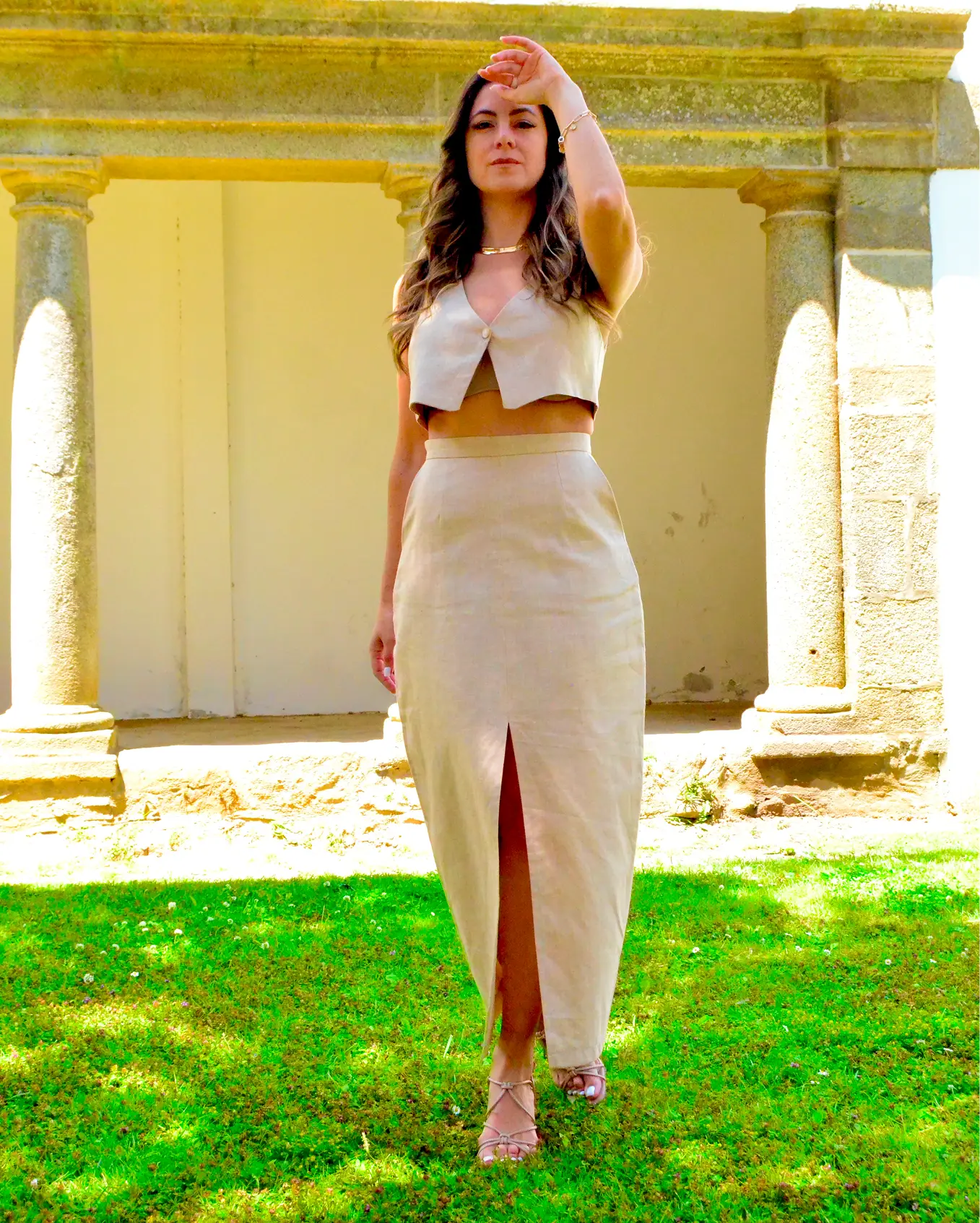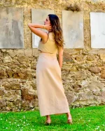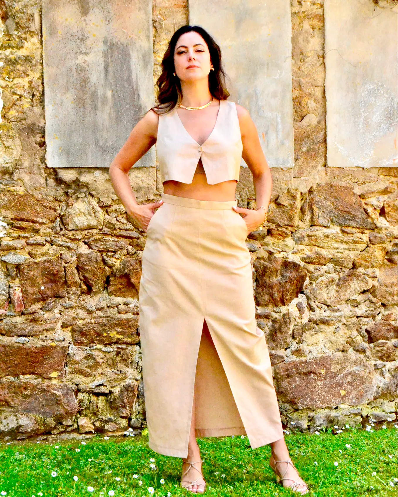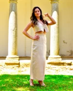Inspirado na elegância serena do Quartzo Rutilado, este conjunto traz sofisticação minimalista e atemporal. O colete cropped de decote em V e abotoamento frontal valoriza o tronco com linhas limpas e modernas. A saia longa de cintura alta, com abertura frontal, garante movimento e leveza, equilibrando ousadia e refinamento.