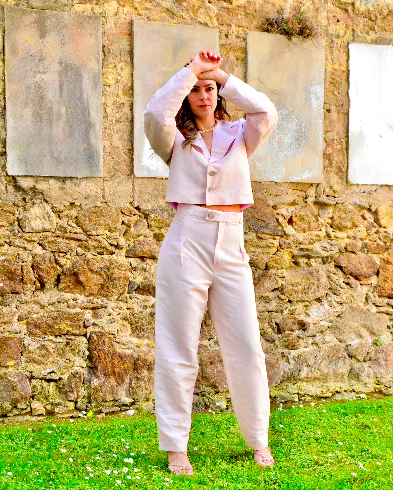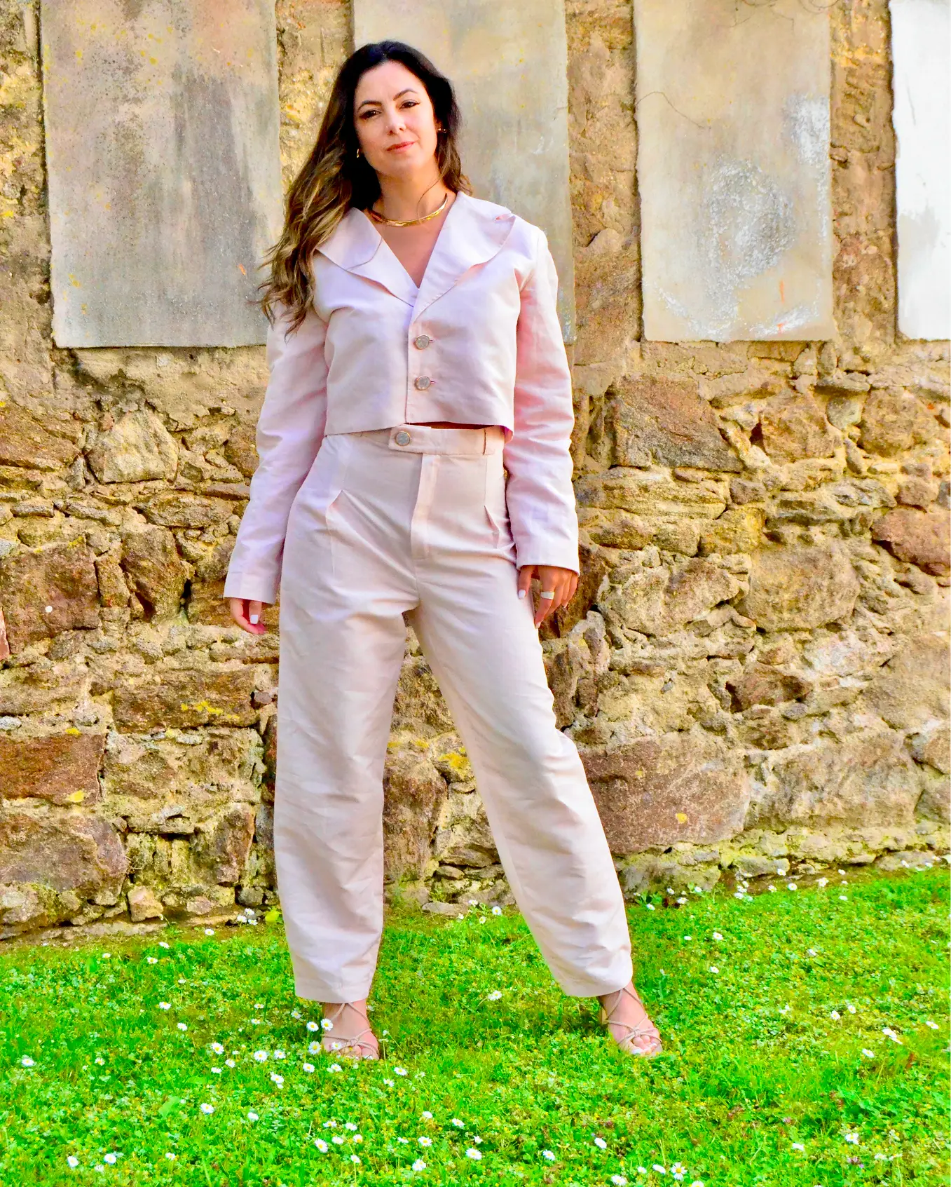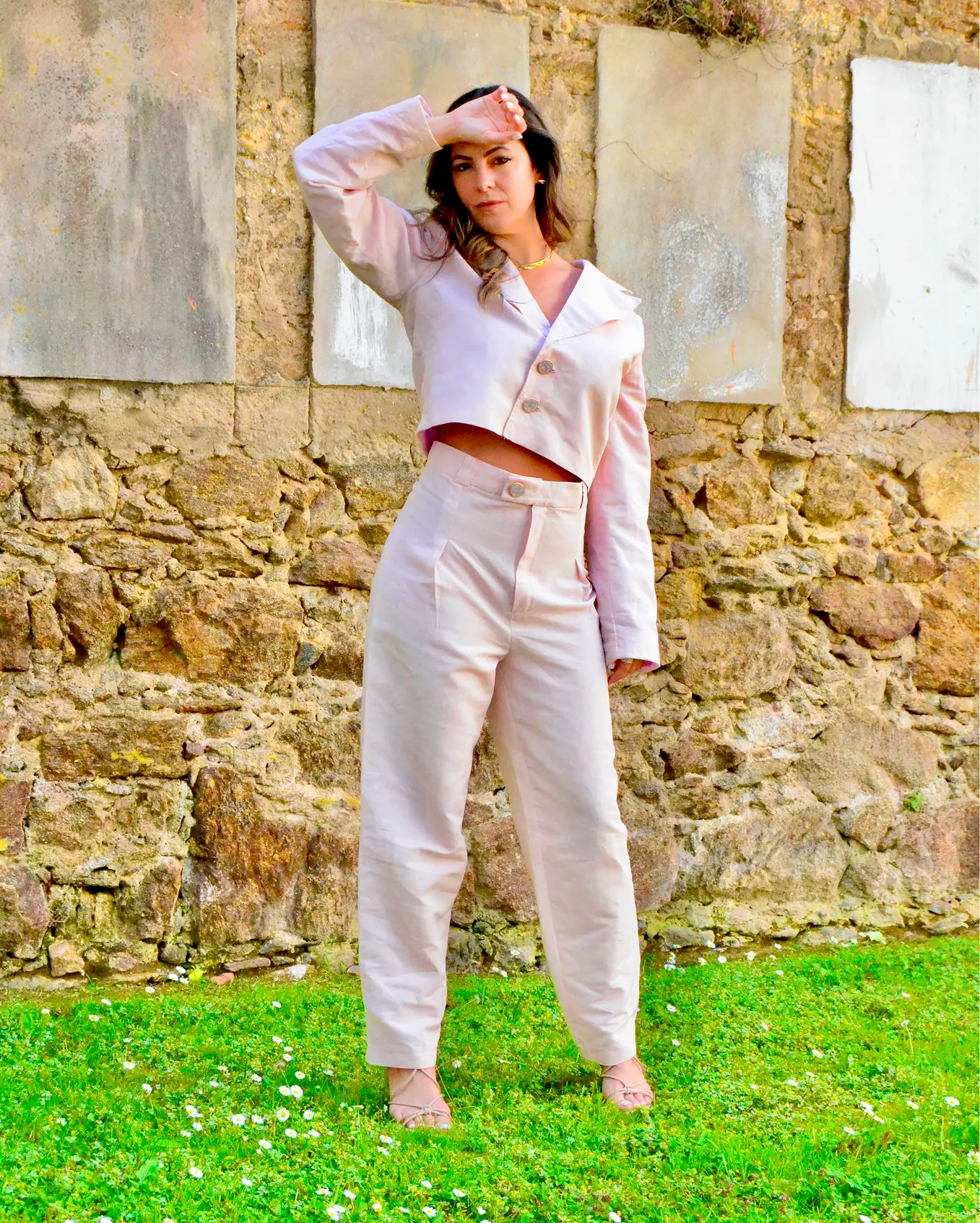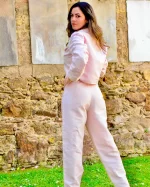 Inspirado na delicadeza e no brilho suave da Thulita, este conjunto expressa feminilidade contemporânea com leveza e sofisticação. O blazer cropped, de linhas retas e botões frontais, equilibra estrutura e fluidez, criando uma silhueta moderna e versátil. A calça de cintura alta, de corte reto, valoriza a postura e garante conforto com elegância minimalista.